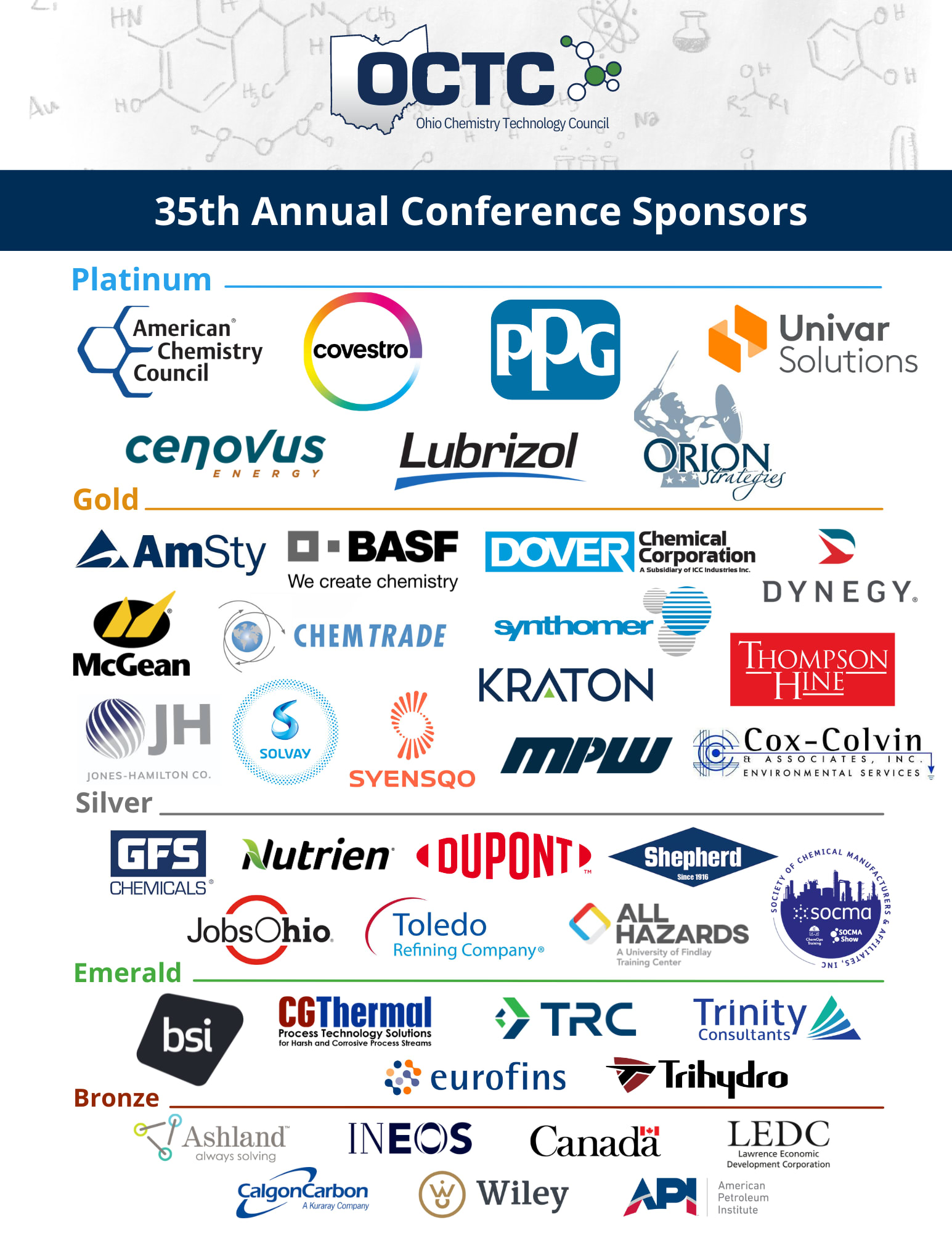 The 35th Annual Conference is a great opportunity to educate your employees, grow your network with Ohio's chemistry professionals, and engage with our state legislative leaders. Sponsoring this event ensures your company gets the most out of your time in Columbus. See our sponsorship options below!